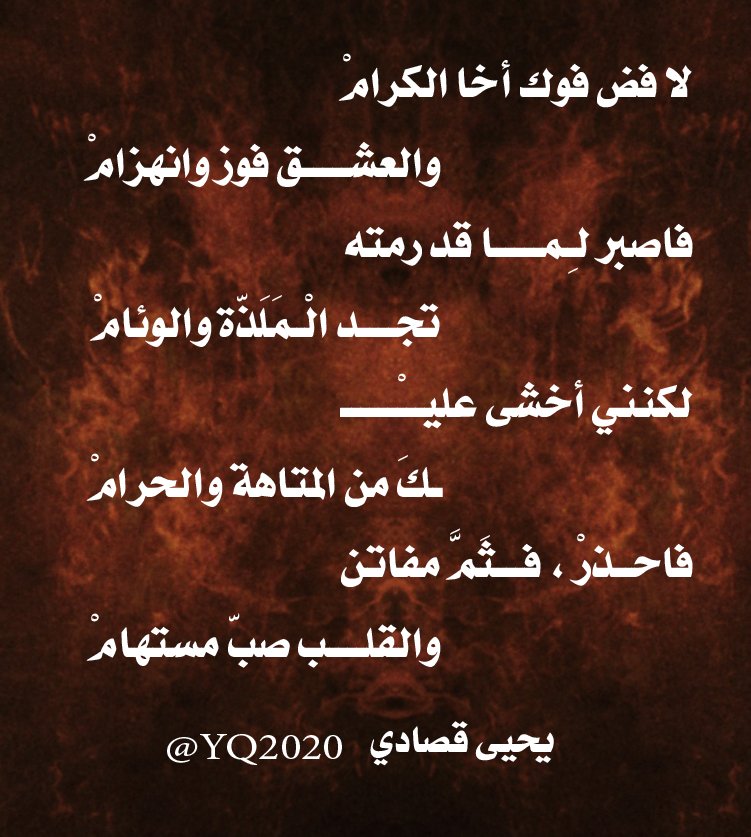 يحيى قصادي Auf Twitter لا فض فوك أخا الكرام والعشق فوز وانهزام فاصبر لما قد رمته تجد الملذ ة والوئام يحيى قصادي Https T Co Vgomnsrc8q