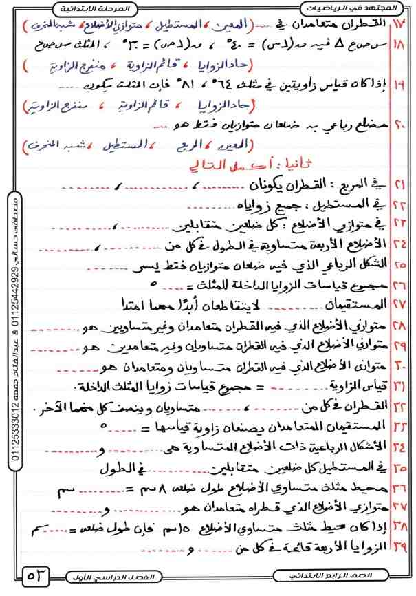 مراجعة ليلة الامتحان الرياضيات الصف الرابع الابتدائى طالب