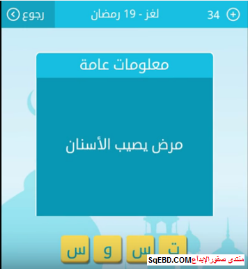 جواب سؤال مرض يصيب الاسنان من 4 حروف من لغز 19 رمضان من لعبة رشفة رمضانية صقور الإبدآع